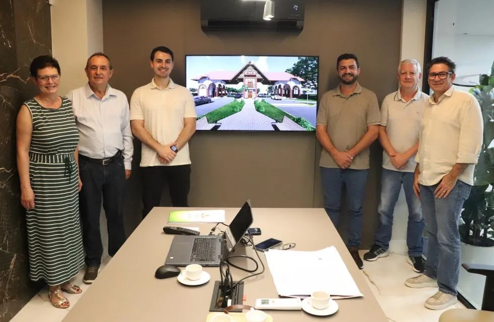 Para alinhar os detalhes da obra, o prefeito Adriano Backes e o secretário de Desenvolvimento Econômico, Claudio Kohler (Claudinho), participaram de uma reunião no escritório Carpenedo Rheinheimer Arquitetura e Engenharia, com os arquitetos Vilson Rheinheimer e Margarete Carpenedo Rheinheimer, além dos engenheiros civis Lucas Rheinheimer e Miguel Carpenedo.