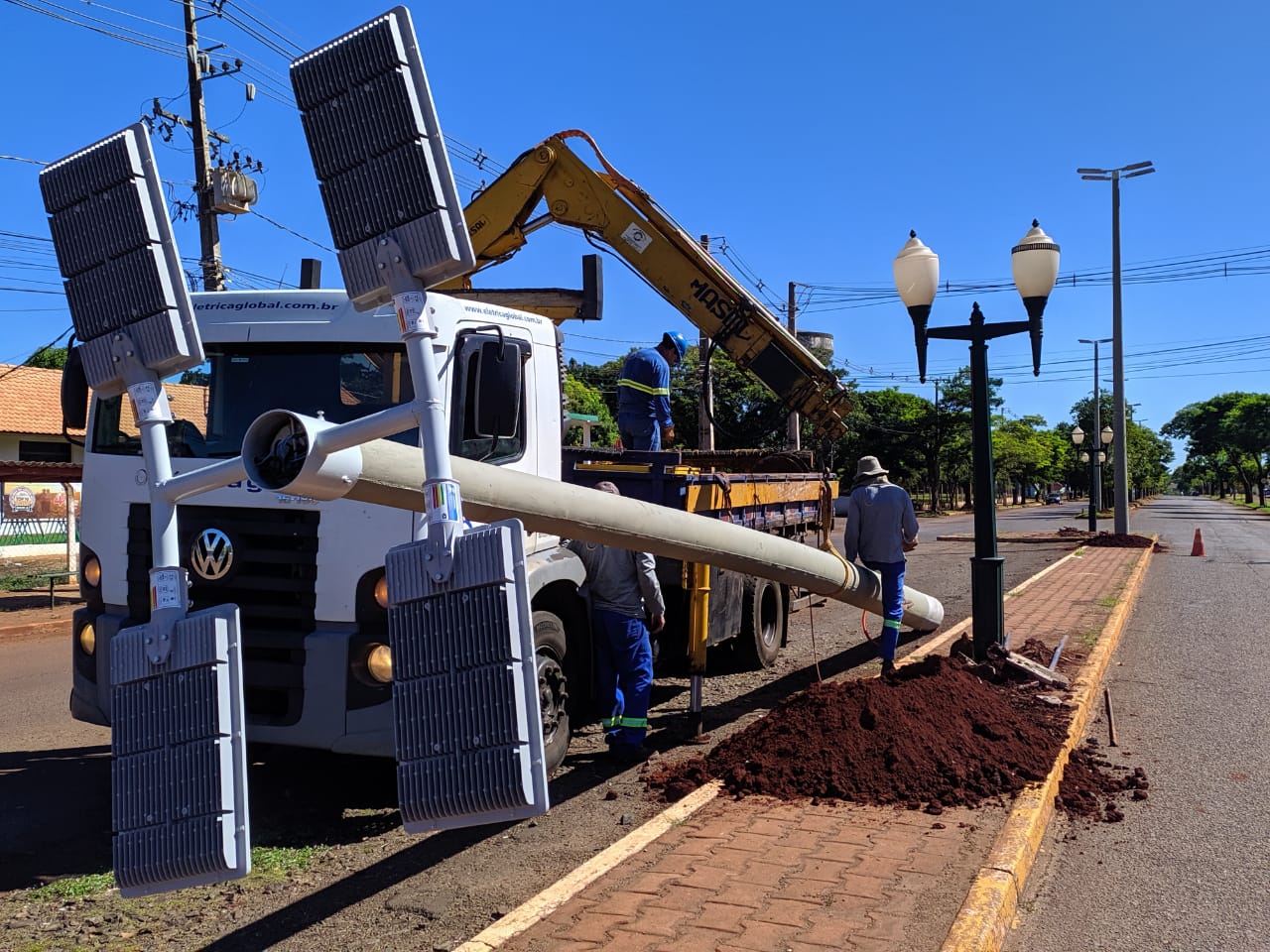 A empresa vencedora do processo licitatório, a Elétrica Global Construtora de Obras Eirelli, após realizar a escavação para a implantação dos eletrodutos, por onde passará a fiação, e das caixas de passagem, agora trabalha na colocação dos postes para a implantação de nova iluminação na Avenida Rio Grande do Sul, no trecho entre a rua Independência e o portal da cidade.