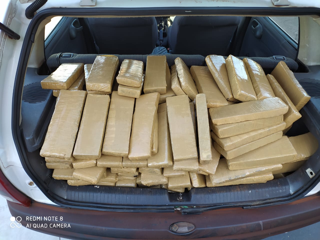 Posteriormente, foi feito uma busca no interior do automóvel e no condutor do sexo masculino, 19 anos, quando foi localizado no assoalho e no porta-malas, nove (09) fardos contendo 274 tabletes de Maconha. Após pesada a droga totalizou 193,800Kg (cento e noventa e três quilos e oitocentas gramas).