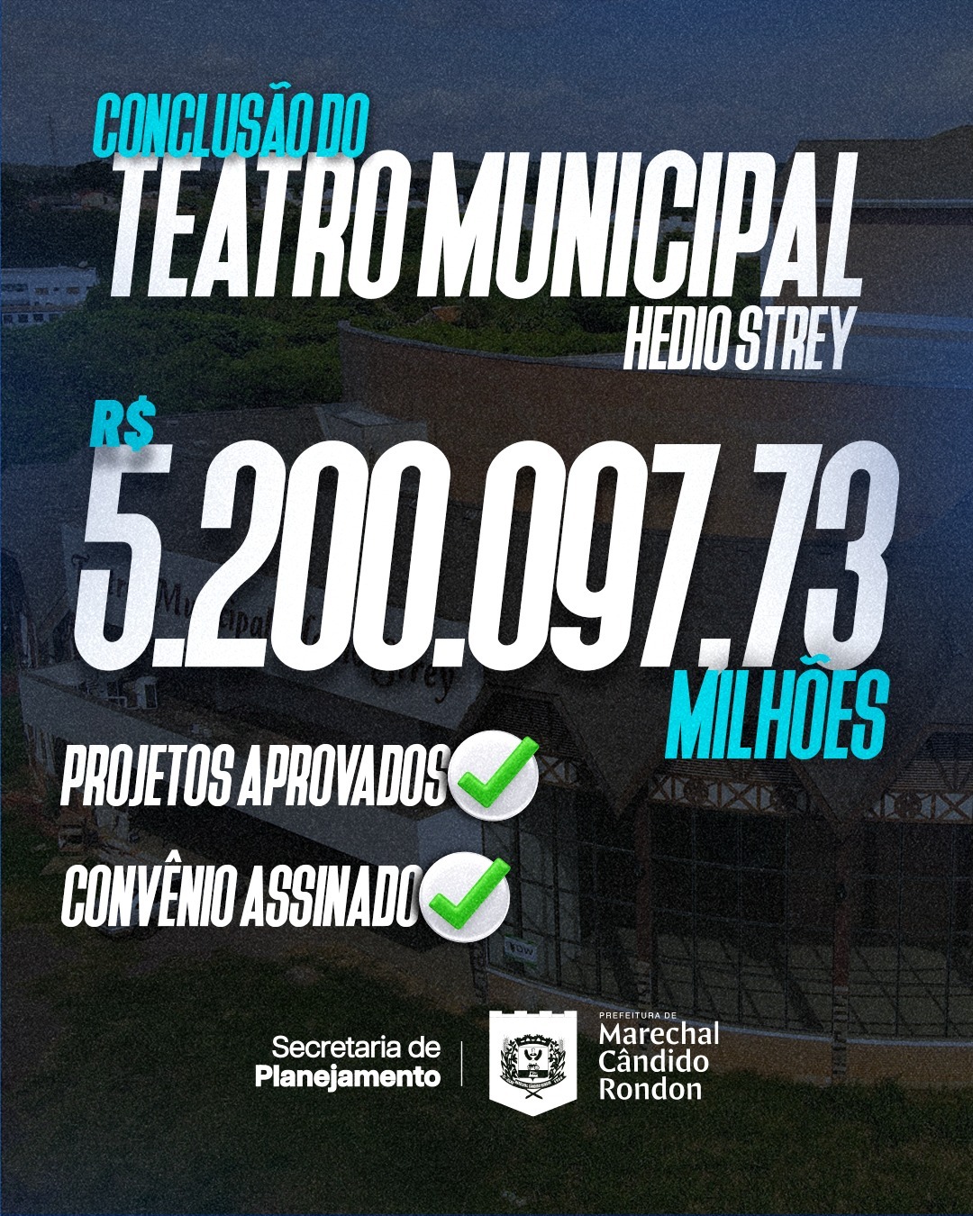 O prefeito de Marechal Cândido Rondon, Adriano Backes, anunciou a assinatura do convênio que garante os recursos para a conclusão do Teatro Municipal Hedio Strey, uma obra aguardada há mais de 15 anos pela comunidade rondonense.