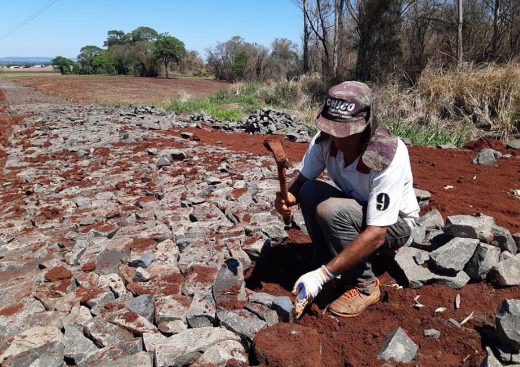 Aproximadamente quatro quilômetros de pavimentação poliédrica estão em execução na estrada principal, da comunidade de Linha Flor do Oeste, distrito de Iguiporã.