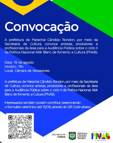 A prefeitura de Marechal Cândido Rondon, por meio da Secretaria de Cultura, promove uma audiência pública no dia 19 de agosto, às 19h, na Câmara de Vereadores. O encontro integra o Ciclo II da Política Nacional Aldir Blanc de Fomento à Cultura (PNAB) e tem como objetivo discutir, de forma participativa, a elaboração do Plano de Aplicação dos Recursos (PAR) para os próximos quatro anos.