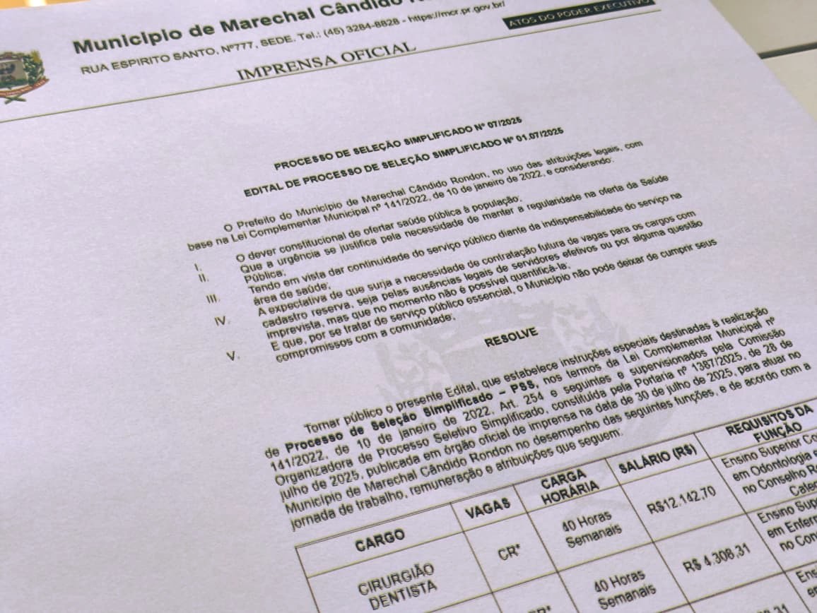 A prefeitura de Marechal Cândido Rondon, por meio da Secretaria Municipal de Saúde, publicou nesta terça-feira, dia 19, no Diário Oficial Eletrônico, o edital nº 01.07/2025, que regulamenta o Processo de Seleção Simplificado (PSS) para contratação temporária de profissionais da saúde. O objetivo é garantir a continuidade e qualidade dos serviços oferecidos à população, suprindo necessidades imediatas da rede municipal.