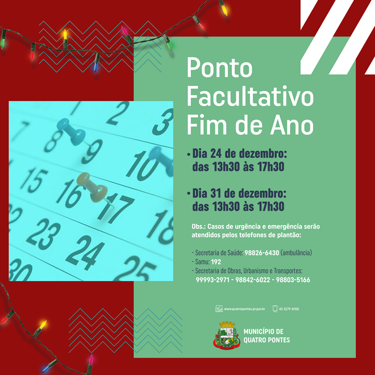 A Prefeitura de Quatro Pontes definiu a programação de ponto facultativo para fim de ano no serviço público municipal, sem prejuízo da prestação dos serviços considerados essenciais, conforme o decreto nº 183/2020.