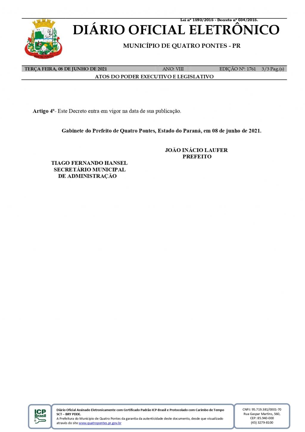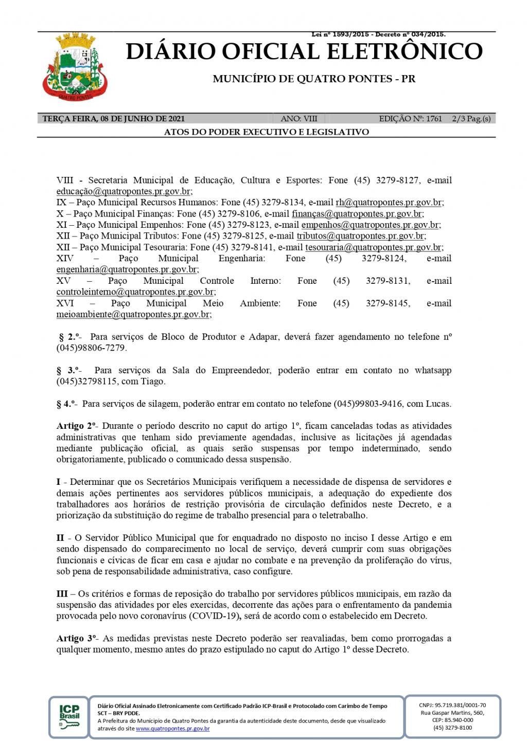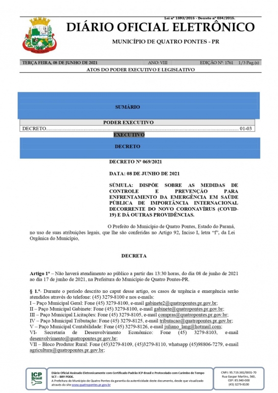 A prefeitura municipal de Quatro Pontes está temporariamente fechada, para o atendimento ao público, diante do registro de um caso positivo de Covid-19.