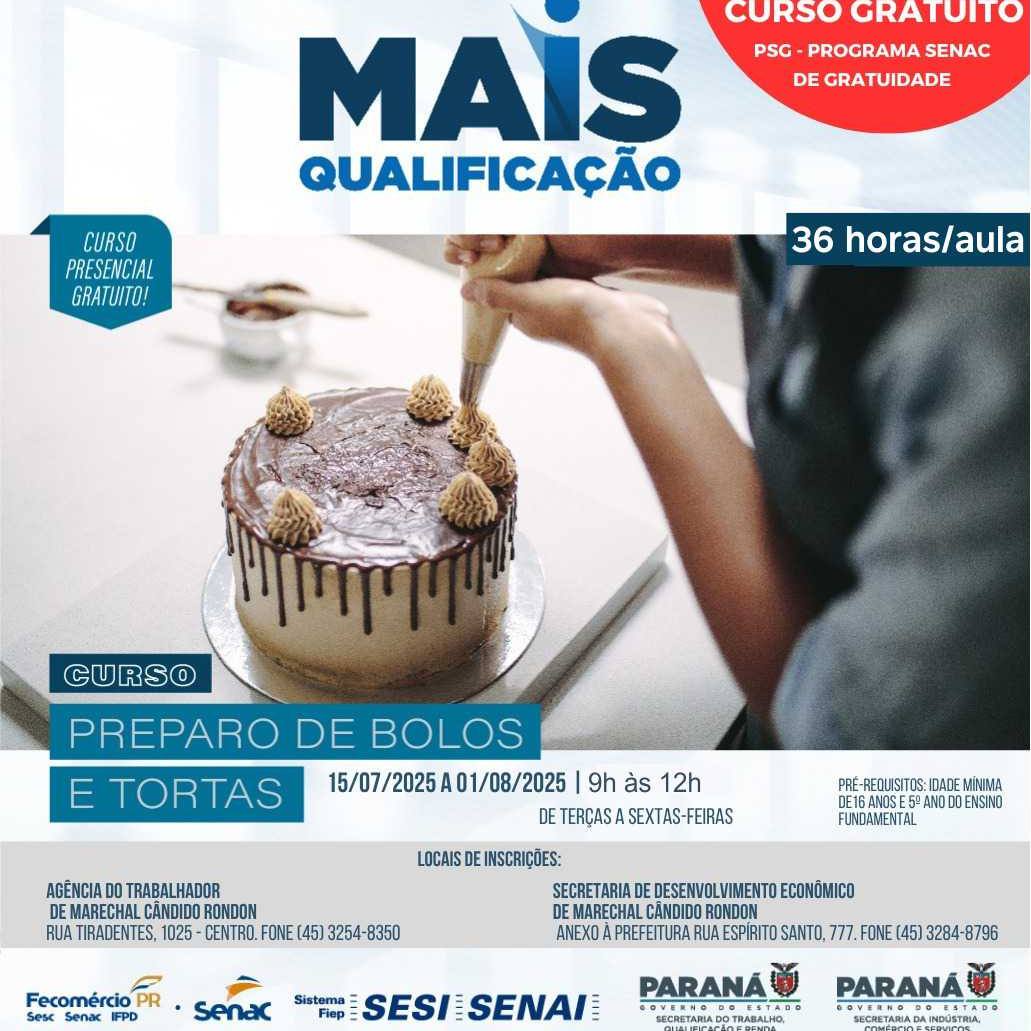 A prefeitura de Marechal Cândido Rondon, por meio da Secretaria de Desenvolvimento Econômico, em parceria com o Senac, por meio do programa “Qualifica Mais” do Governo do Estado, está promovendo dois cursos gratuitos na área de culinária. Trata-se dos cursos de Preparo de Salgados e Preparo de Bolos e Tortas.