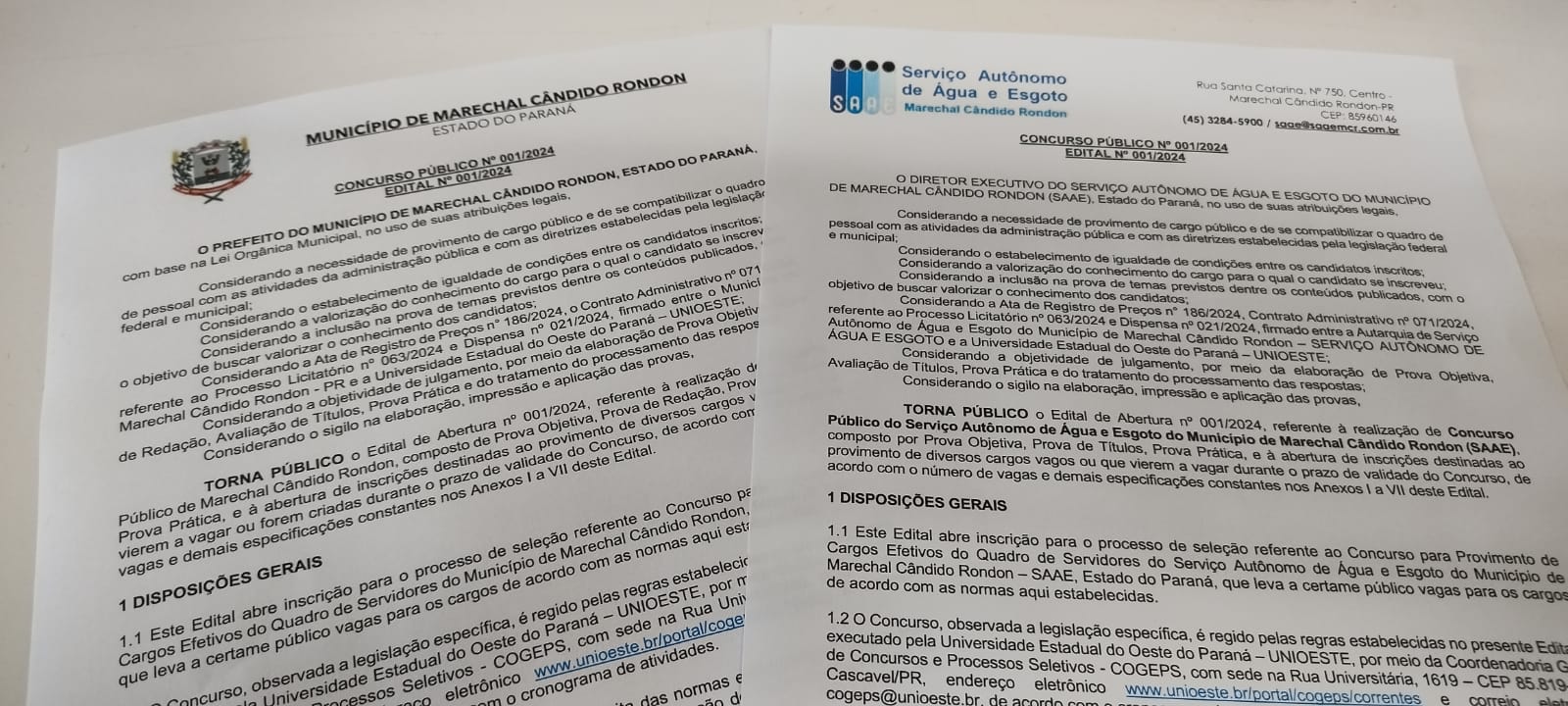 Os editais completos podem ser acessados clicando em: https://concursos.unioeste.br/…/PREFEITURA+MUNICIPAL…/90 (concurso da prefeitura); e https://concursos.unioeste.br/…/SERVI%C3%87O+AUT%C3…/91 (concurso do SAAE).