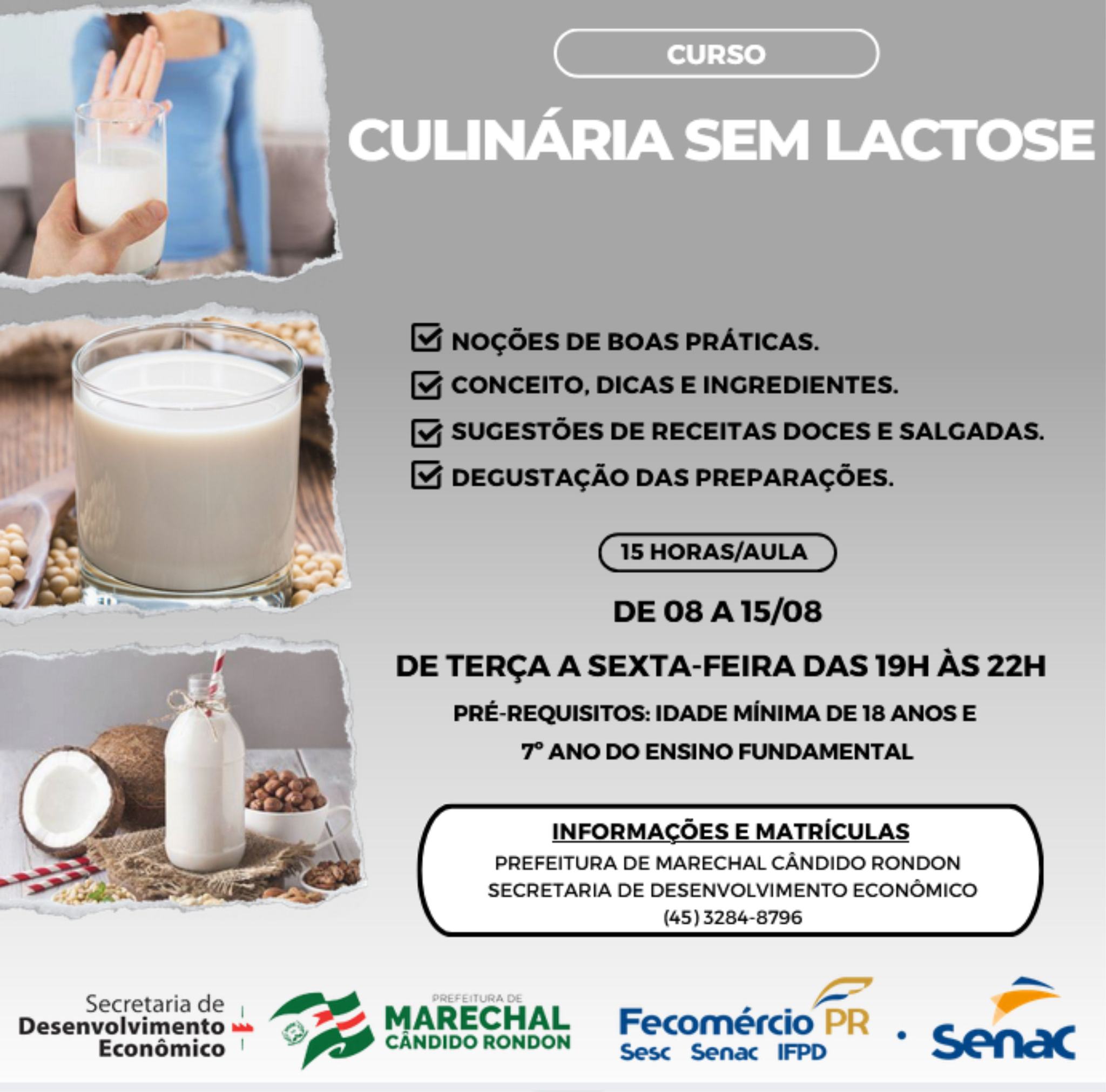 A prefeitura de Marechal Cândido Rondon, através da Secretaria de Desenvolvimento Econômico, oferecerá mais uma importante capacitação para a comunidade rondonense. Trata-se do curso de culinária sem lactose, promovido em parceria com o SENAC, cujas inscrições estão abertas.