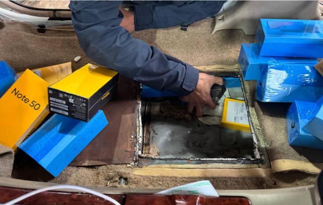 Em verificação ao interior do veículo, os policiais identificaram fundo falso no assoalho que, ao ser aberto, foram encontrados 75 celulares e 6 macbook air.