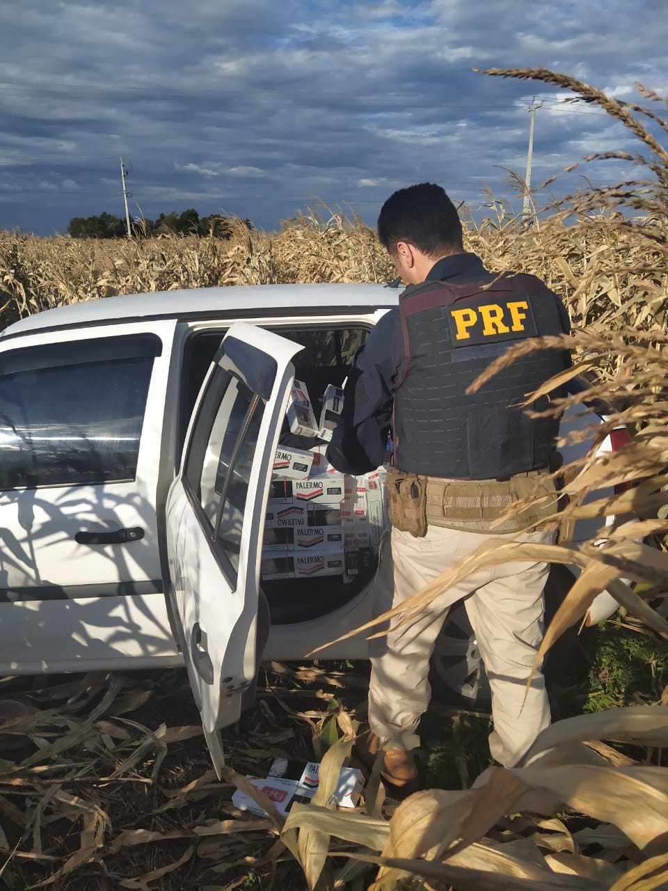 Nas buscas pela região, os PRFs localizaram já abandonado um veículo Gol, de cor branca, carregado com diversas caixas de cigarros de procedência paraguaia.