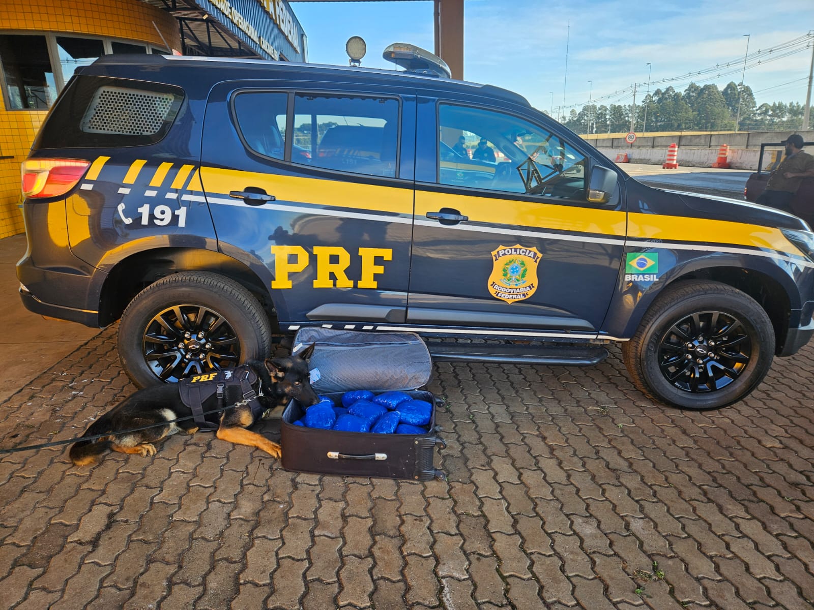 Durante a vistoria no compartimento de bagagens, cães farejadores da PRF identificaram uma mala suspeita. Os policiais abriram a bagagem e encontraram tabletes da droga, que totalizaram 9,8 quilos.