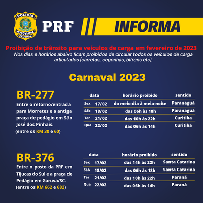 A restrição acontece sempre no sentido do maior fluxo, na descida para o litoral paranaense e Santa Catarina e sentido capital no retorno. Os bloqueios, na BR-277, acontecerão na antiga praça de pedágio em São José dos Pinhais (PR), no km 60 e no viaduto de acesso a Morretes, no km 30. Já na BR-376, os bloqueios estarão sendo realizados entre a entrada para Campo Alto, em Tijucas do Sul (PR), no km 648 e a praça de pedágio em Garuva (SC), no km 682.