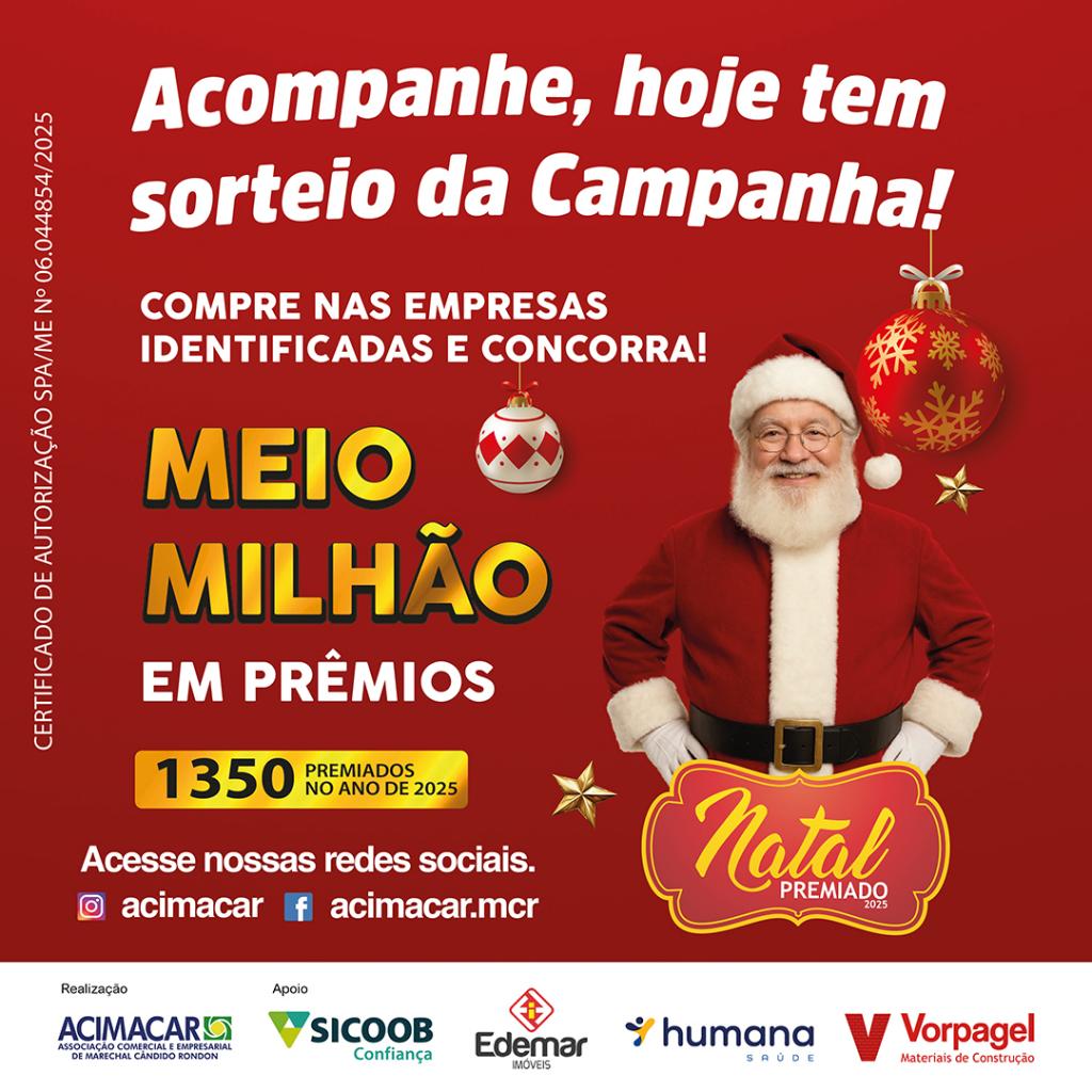 Acontece nesta terça-feira (16) o primeiro sorteio da campanha Natal Premiado, promovida pela Associação Comercial e Empresarial de Marechal Cândido Rondon (Acimacar).