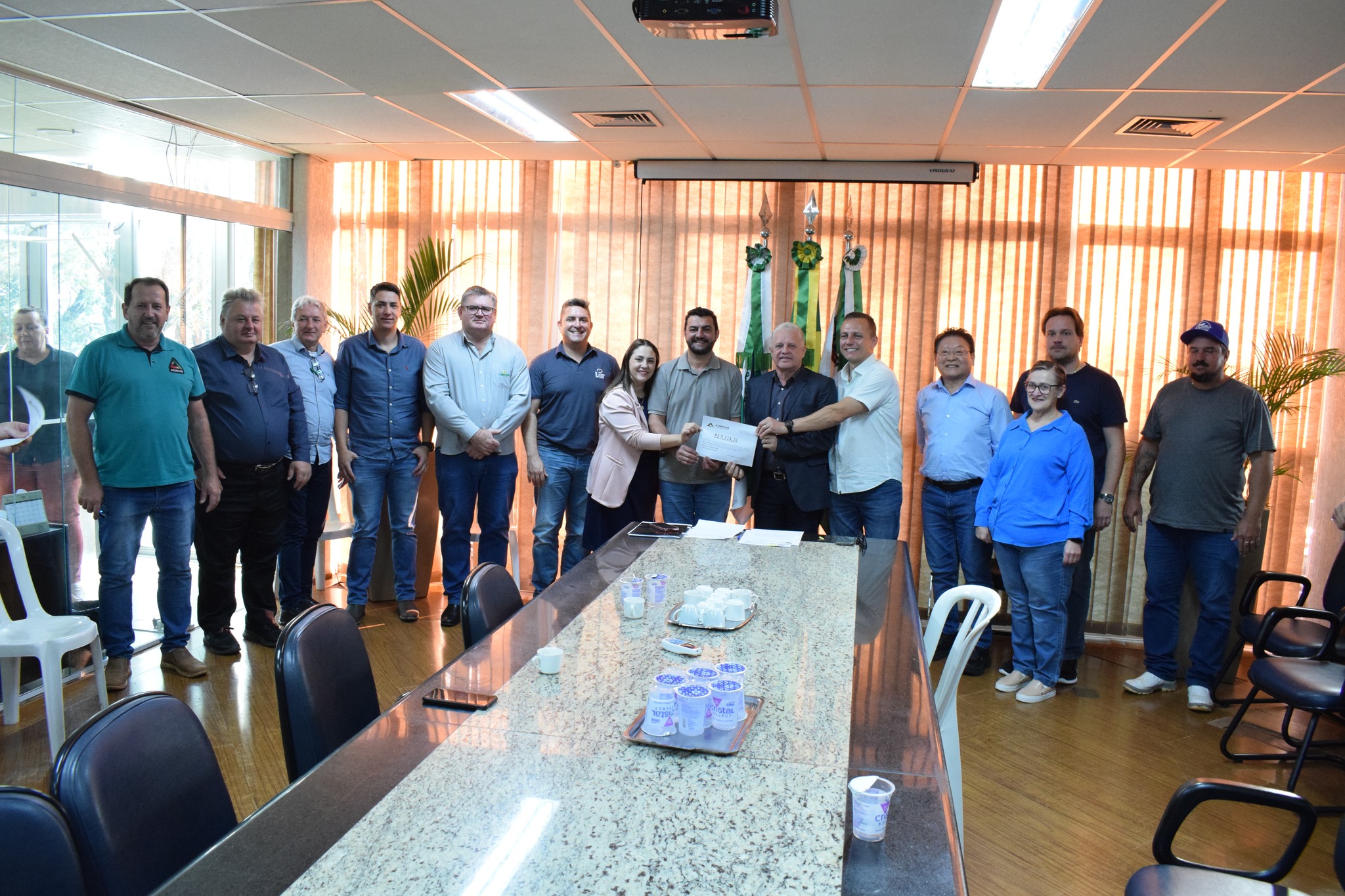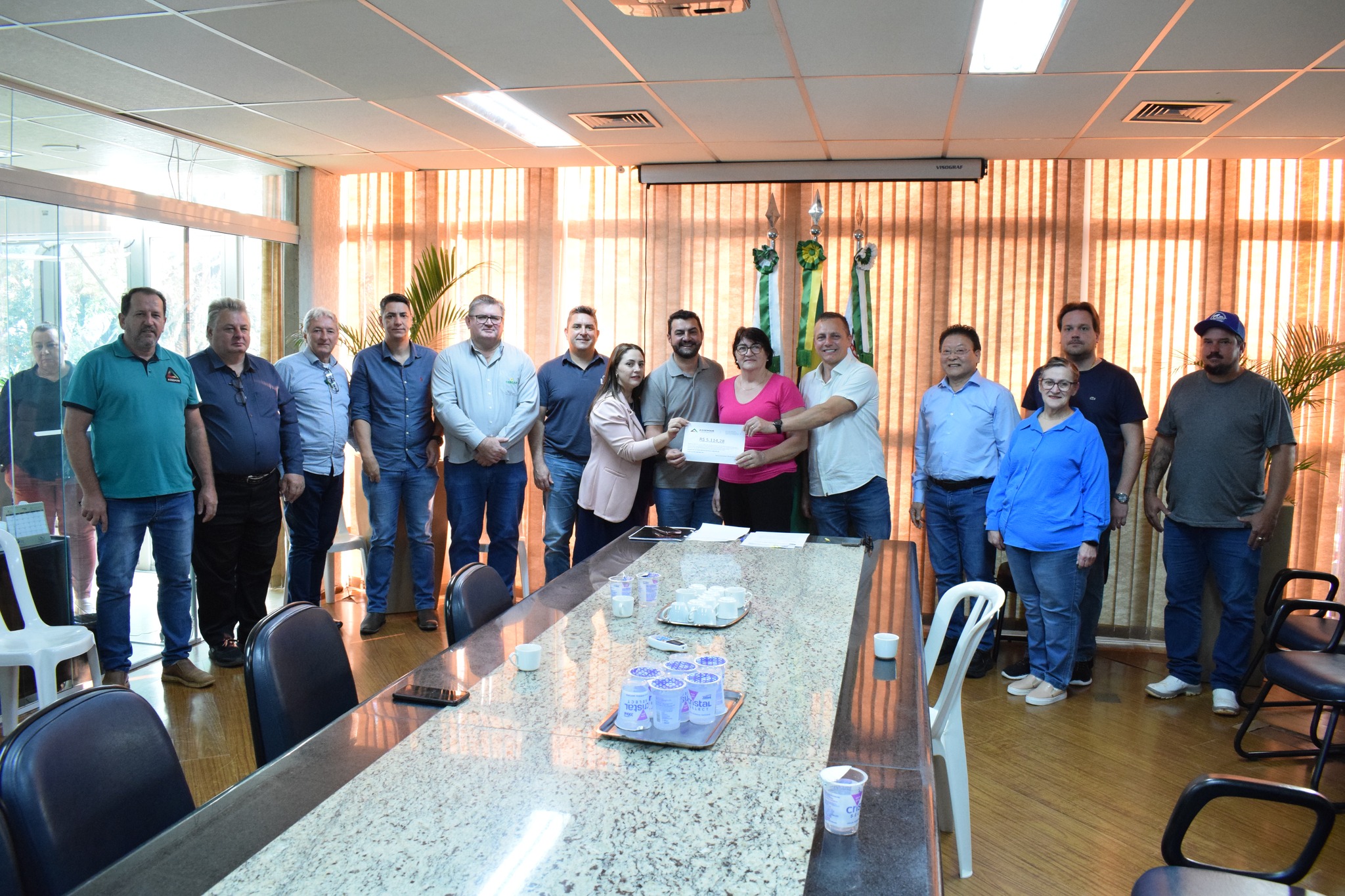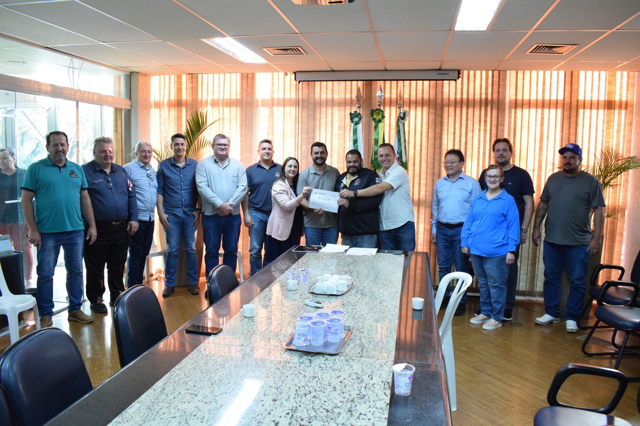 O prefeito Adriano Backes, o vice-prefeito Vanderlei Sauer e a secretária de Assistência Social e primeira-dama, Andria Backes, receberam na prefeitura os representantes das instituições beneficiadas com a feijoada beneficente. Também participaram do encontro secretários municipais, além de demais servidores e representantes da Acimacar e da PROEM.