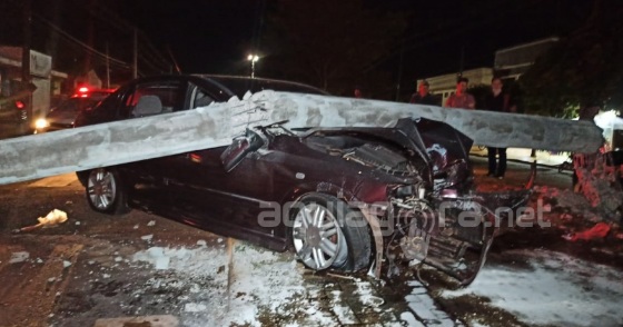 O poste instalado no canteiro central da avenida, quebrou com o impacto e caiu sobre o carro.