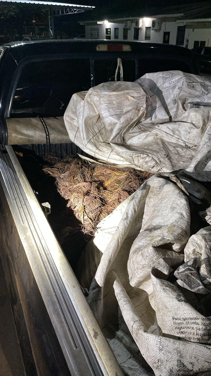 Chegando ao ponto indicado, foi possível constatar o fato, onde havia uma caminhonete Ford F250 de cor preta carregada com fios de cobre já queimados. Em busca no interior do veículo, foi localizado uma pistola calibre 9mm, com dois carregadores contendo ao todo 38 munições.