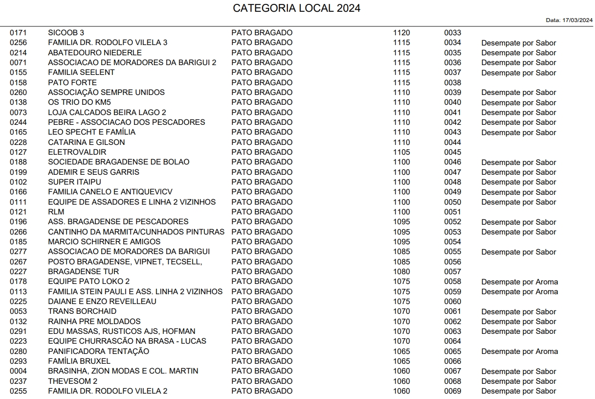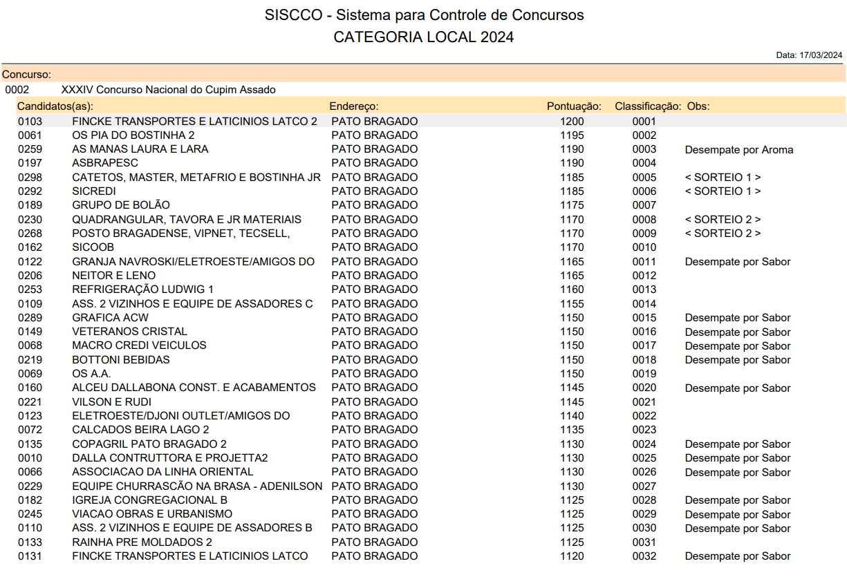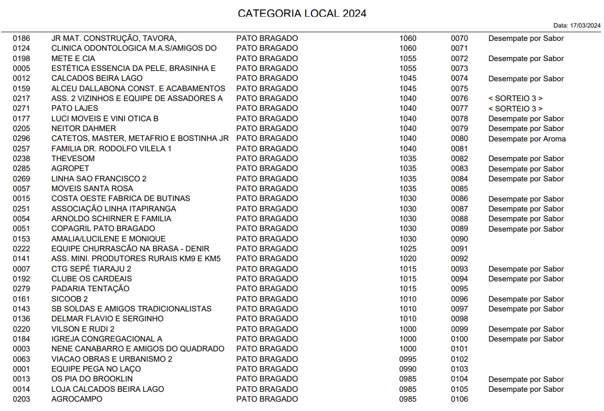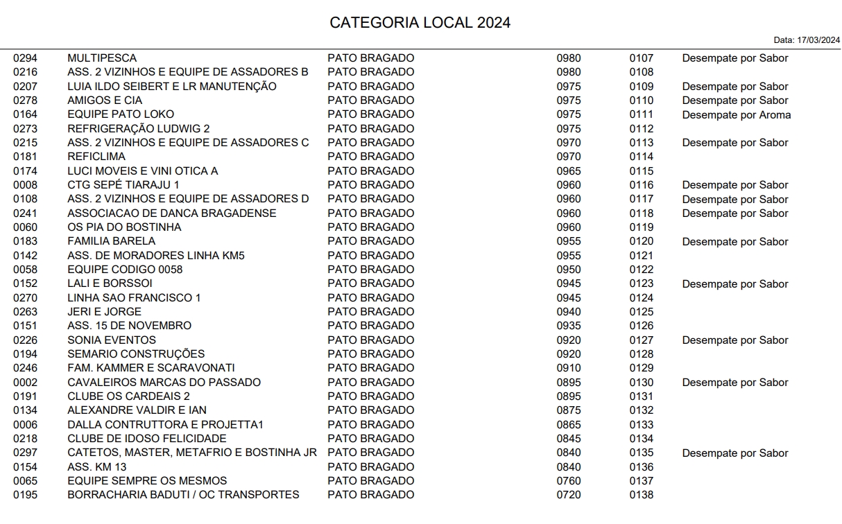Aconteceu no último domingo (17) o 34.º Concurso Nacional do Cupim Assado de Pato Bragado. O concurso contou com 234 equipes inscritas, divididas em 138 equipes na categoria local e 96 na categoria visitante.