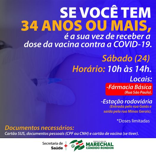O cronograma de vacinação contra a Covid-19 terá sequência neste sábado, dia 24, em Marechal Rondon.