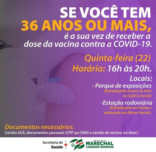A Secretaria de Saúde de Marechal Rondon definiu o cronograma de imunização para esta quinta-feira, dia 22. Das 8h às 13h, na estação rodoviária, serão aplicadas doses em trabalhadores da saúde, do ensino básico, do ensino superior e profissionalizante, da limpeza urbana, do transporte coletivo, do sistema de privação de liberdade e caminhoneiros.