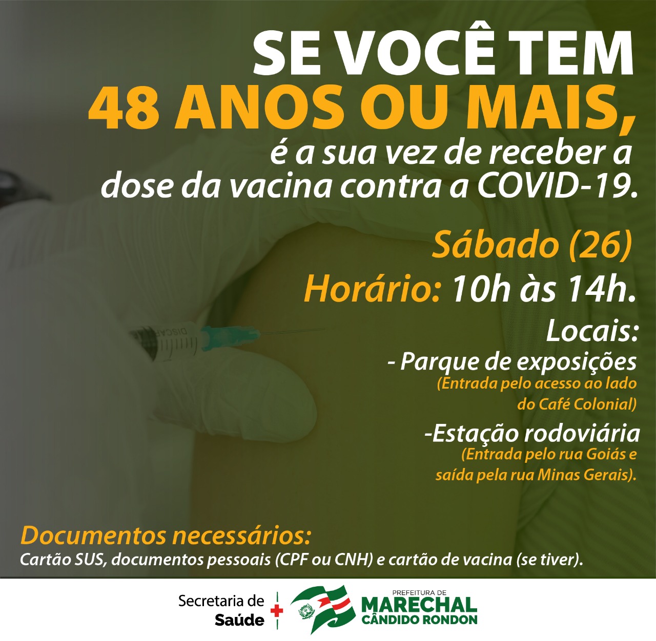 A Secretaria de Saúde de Marechal Rondon dará sequência neste sábado, dia 26, à vacinação contra a Covid-19 para pessoas com 48 anos ou mais, primeira dose. Também serão imunizadas pessoas com comorbidades ou deficiência permanente, acima de 18 anos, também primeira dose, que ainda não foram vacinadas. Haverá 750 doses disponíveis.