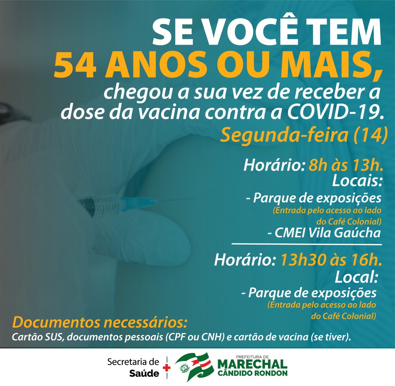 Nesta segunda-feira (14) o cronograma de vacinação em Marechal Rondon terá seqüência para pessoas com 54 anos ou mais.
