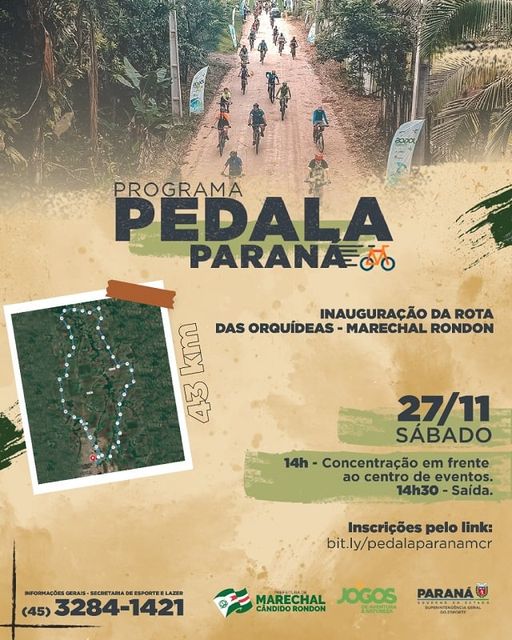 Estão abertas durante esta semana as inscrições ao Programa Pedala Paraná, evento que integra os Jogos de Aventura e Natureza. Foram lançadas 80 ciclorrotas em todo o Paraná, sendo que Marechal Rondon apresentou uma sugestão à Superintendência do Esporte, e foi contemplado com uma delas.
