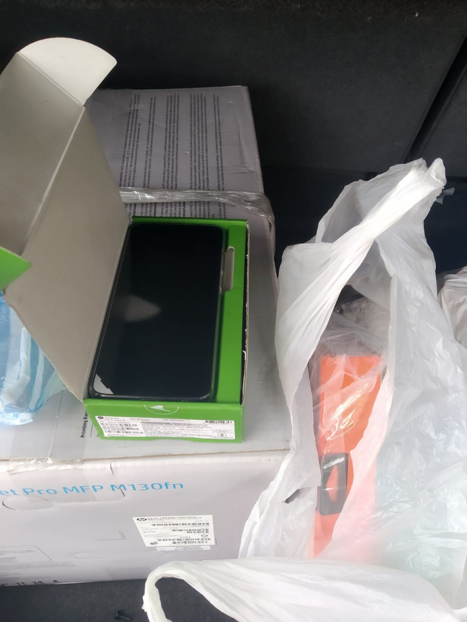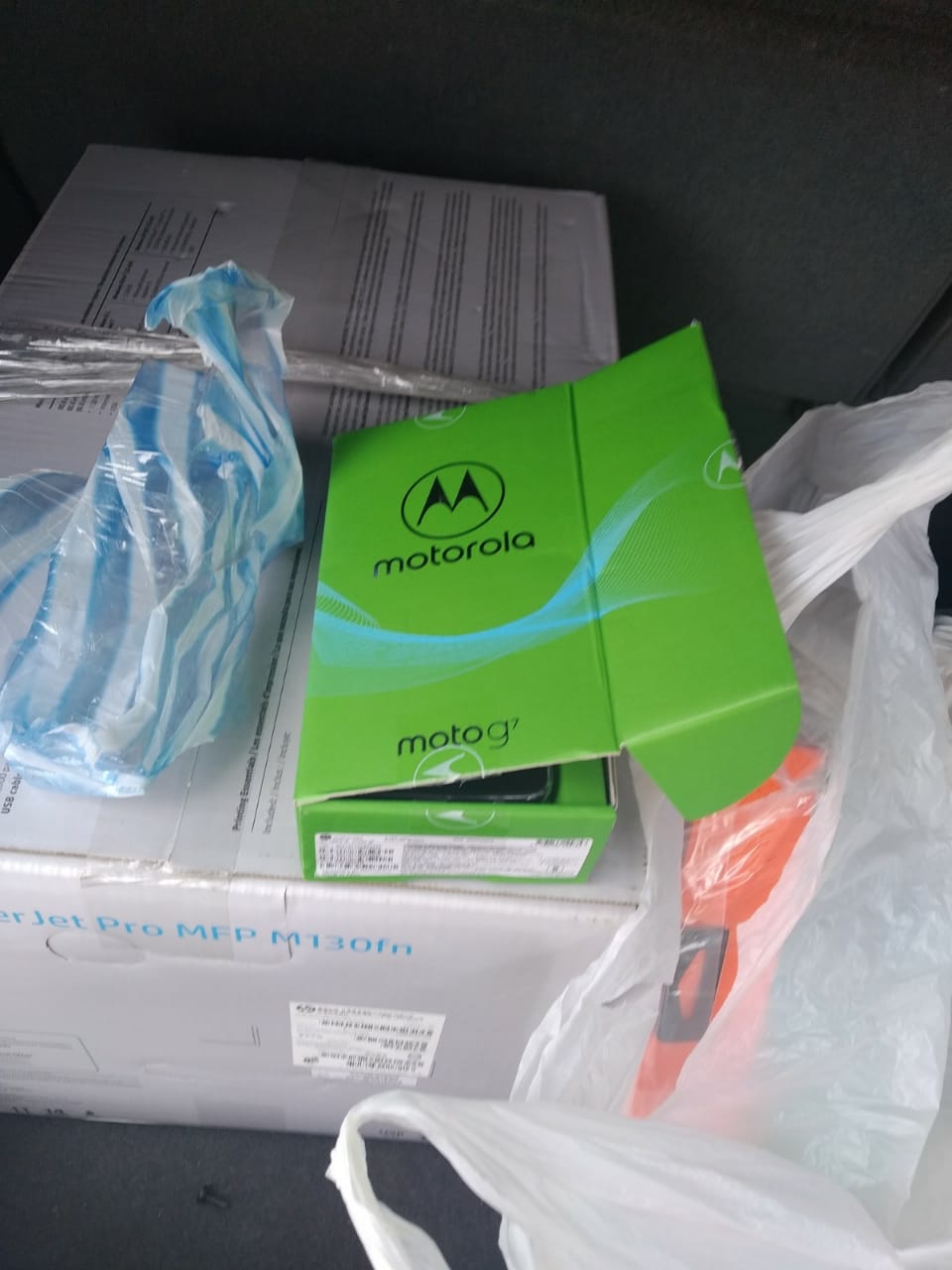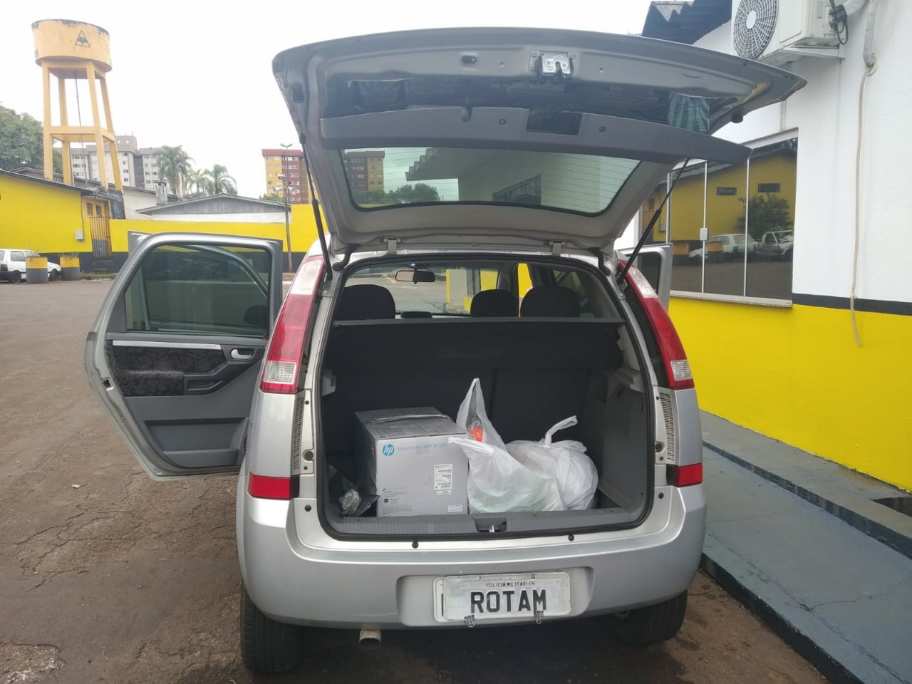 No porta-mala do veículo Meriva os militares da ROTAM ainda apreenderam aparelhos de modem, diversos perfumes e uma impressora.