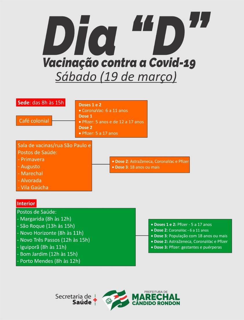 A Secretaria de Saúde de Marechal Cândido Rondon programou para sábado, dia 19 de março, o dia “D” de vacinação contra a Covid-19. Na sede, a aplicação de vacinas será das 8h às 15h.
