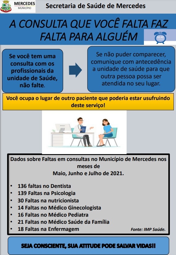 Um levantamento realizado pela Secretaria de Saúde de Mercedes aponta que nos meses de maio, junho e julho deste ano, 374 pessoas faltaram nas consultas que foram previamente agendadas.