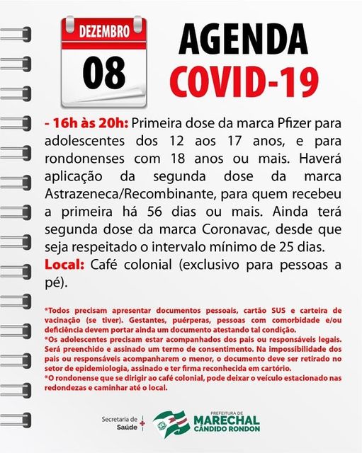 A Secretaria de Saúde de Marechal Cândido Rondon divulga o roteiro de vacinação contra a Covid-19, estabelecido para quarta-feira (08). Será ofertada novamente a primeira dose da vacina da Pfizer para adolescentes dos 12 aos 17 anos, e para rondonenses com 18 anos ou mais. O atendimento será das 16h às 20h, exclusivamente no café colonial.