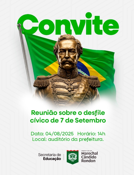 A Secretaria Municipal de Educação de Marechal Cândido Rondon convida todos os interessados em participar do tradicional desfile cívico de 7 de Setembro para uma reunião de alinhamento e orientações. Estão convidados a participar representantes de educandários, forças militares e grupos de escoteiros. O desfile deste ano será exclusivamente voltado a esses grupos, uma vez que entidades e associações participam dos desfiles alegóricos realizados durante os festejos de aniversário do município, cujo próximo será em julho de 2026.