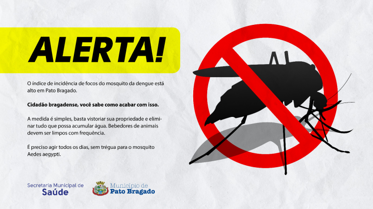 Mesmo com o intenso trabalho dos agentes do setor de endemias, a população precisa reforçar diariamente os cuidados contra o mosquito Aedes aegypti, eliminando os locais com água parada. Ao apresentar qualquer sinal da doença, procurar imediatamente o setor da saúde.