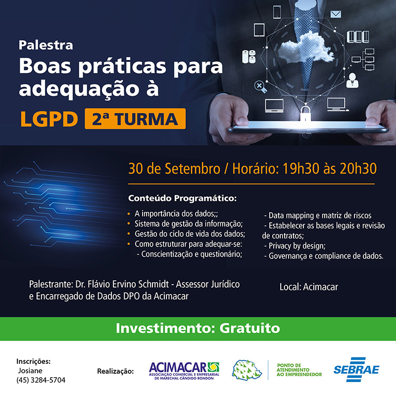 O evento ocorre das 19h30 às 20h30 na sede da entidade; a palestra é gratuita e será ministrada pelo Assessor Jurídico e Encarregado de Dados DPO da Acimacar, advogado Flávio Ervino Schmidt.