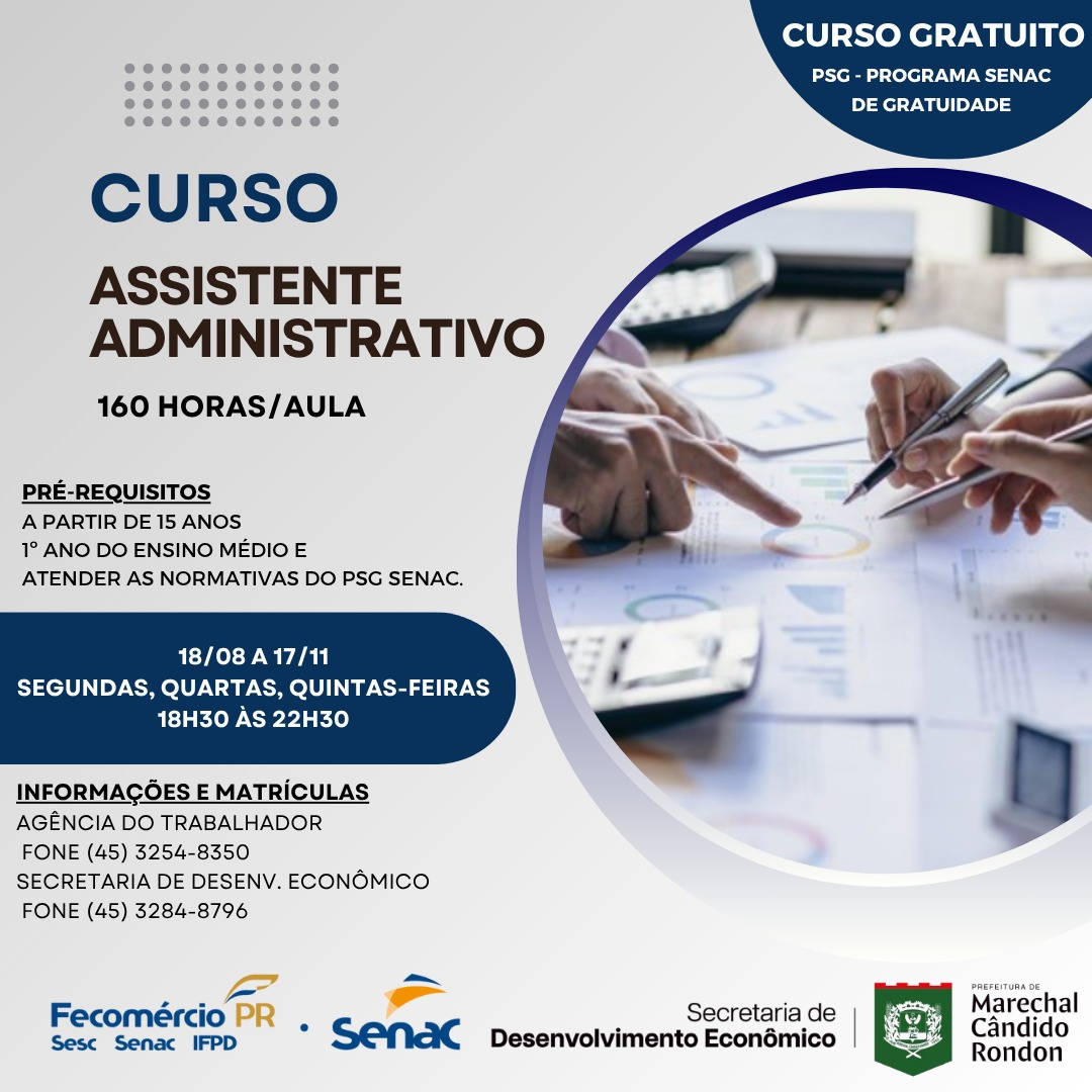 O Senac Paraná, em parceria com a prefeitura de Marechal Cândido Rondon, através da secretaria de Desenvolvimento Econômico, abriu as inscrições para uma nova turma do curso gratuito de Assistente Administrativo. A formação é voltada a pessoas que desejam se qualificar para o mercado de trabalho e ampliar suas chances de empregabilidade.