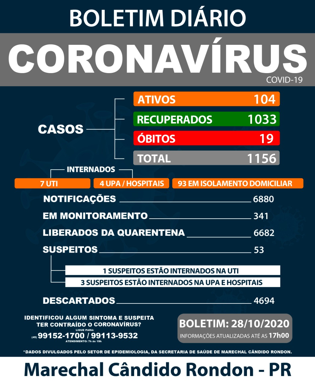 O município de Mal Rondon segue com 104 casos ativos da doença e destes sete rondonenses estão internados em UTIs; quatro em Hospitais e UPA; e 93 em isolamento domiciliar.