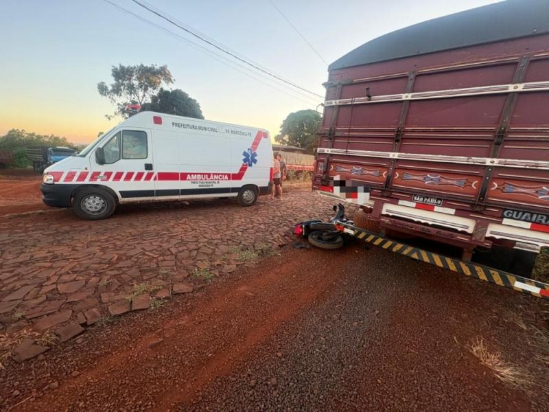 Sol atrapalha visibilidade e moto colide na traseira de caminhão estacionado em Mercedes