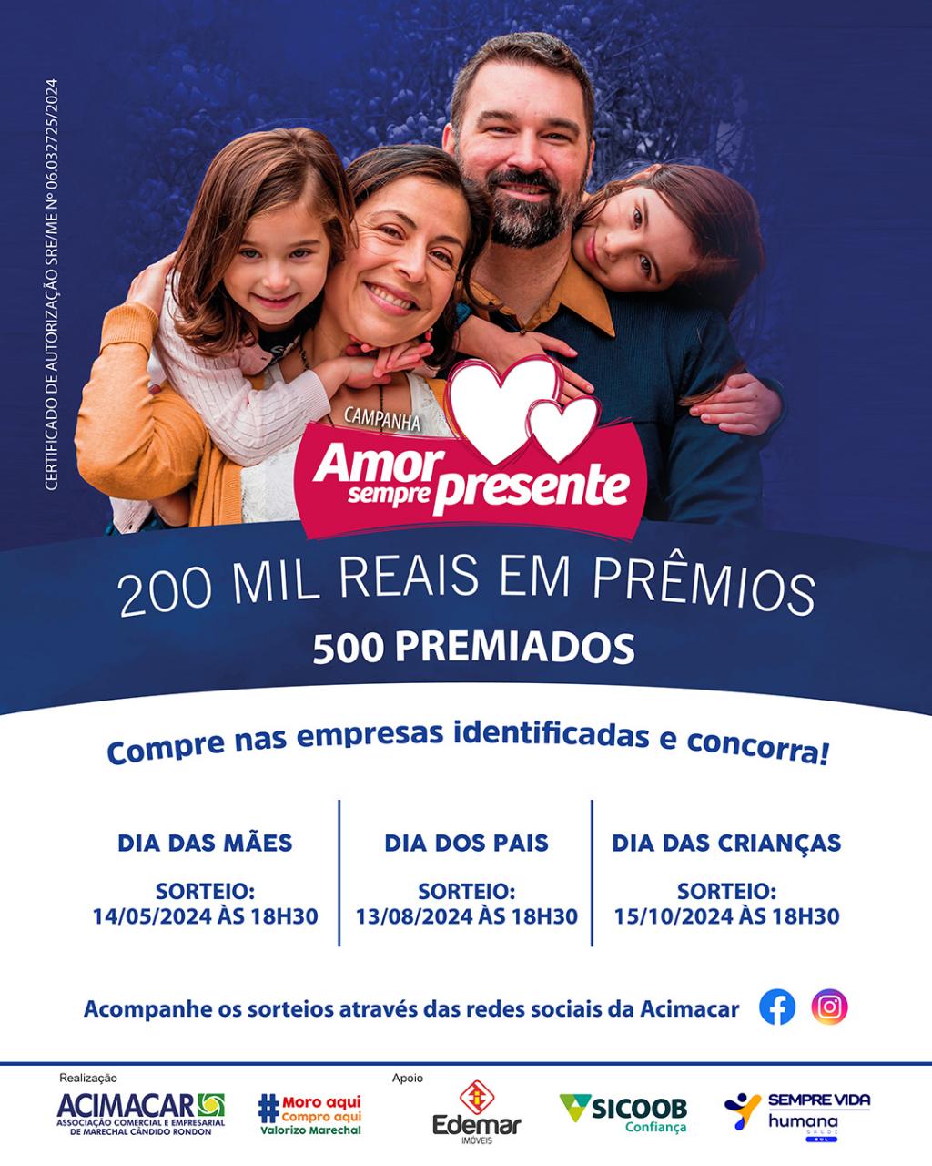 Acontece às 18 horas e 30 minutos de amanhã, terça-feira, o sorteio da campanha Amor Sempre Presente – Dia das Mães, promovida pela Associação Comercial e Empresarial de Marechal Cândido Rondon.