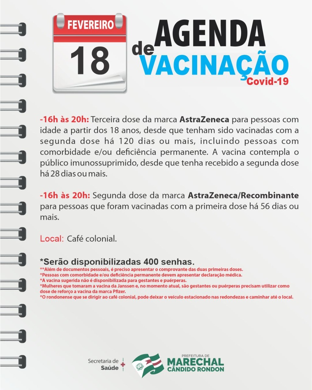 O cronograma de vacinas segue hoje a tarde em Marechal Cândido Rondon, mais uma vez no café colonial, das 16 às 20 horas, com a distribuição de 400 senhas.