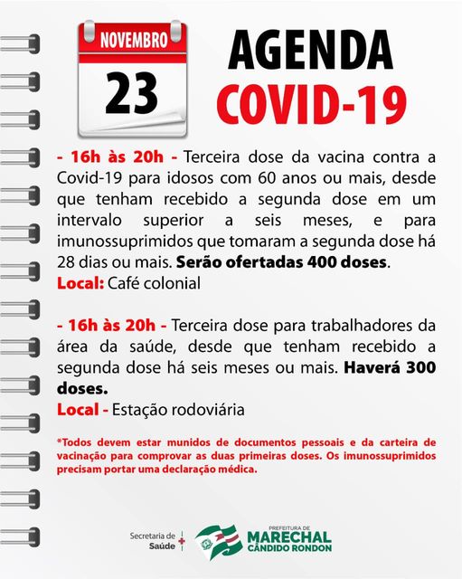 O roteiro de vacinação contra a Covid-19 contempla a aplicação da terceira dose nesta terça-feira (23), em Marechal Cândido Rondon. Podem ser vacinados os idosos com 60 anos ou mais, imunossuprimidos, assim como os trabalhadores da área da saúde.
