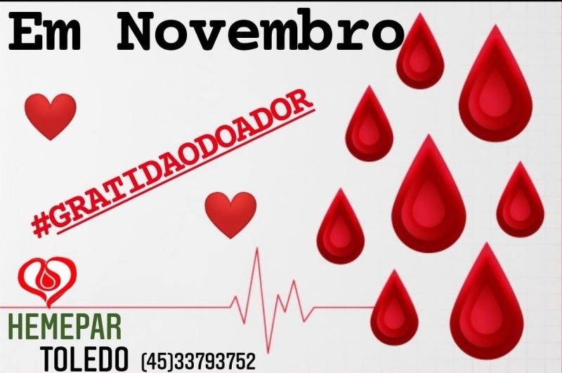 Como uma forma de prestar uma homenagem ao Dia do Doador Voluntário de Sangue, que ocorre no dia 25 de novembro, o Banco de Sangue Centro de Hematologia e Hemoterapia do Paraná de Toledo está promovendo uma ação que começou no dia 03 até o dia 30 deste mês.