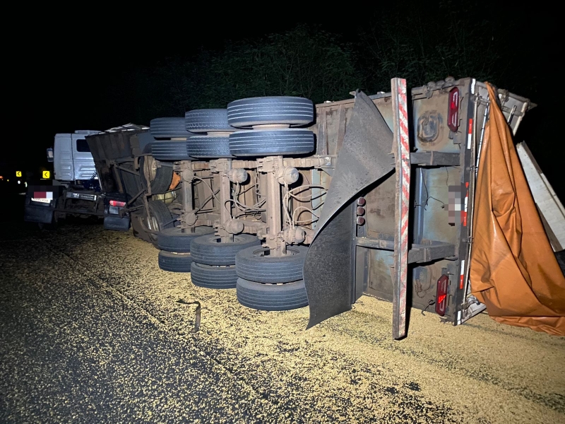 Com o sinistro, a carga de soja ficou espalhada e houve vazamento de óleo combustível na pista.