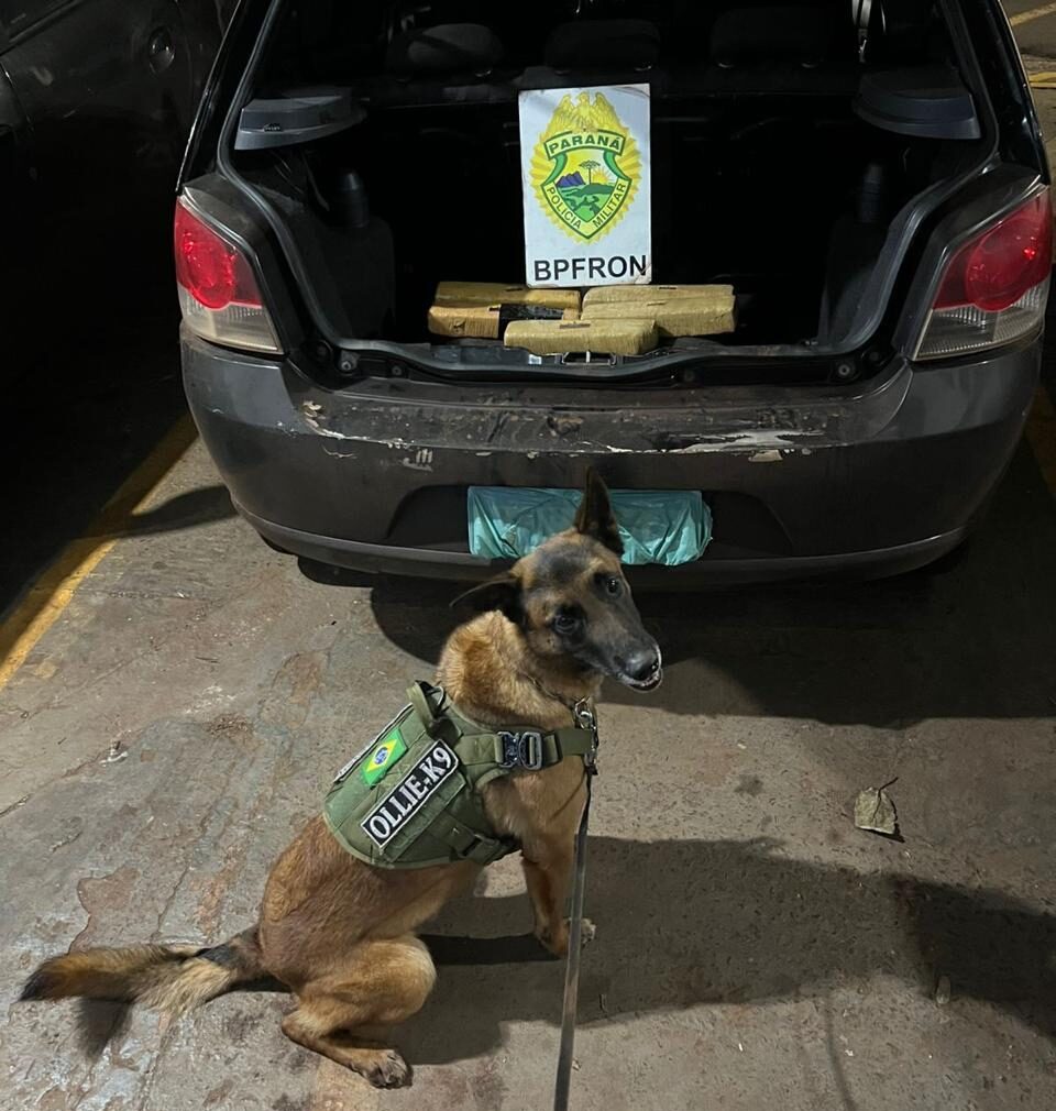 Durante a vistoria, o cão de faro Ollie sinalizou para uma sacola que estava sob o banco do passageiro. Dentro dela, foram encontrados cinco tabletes de maconha, que após pesagem somaram 3,439 kg.