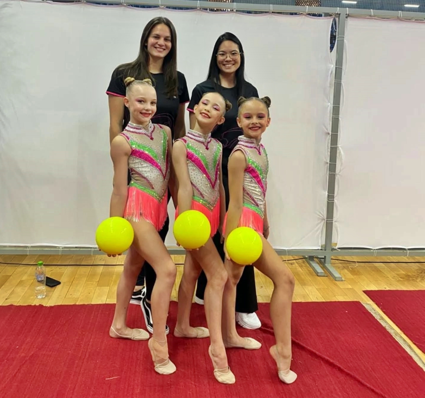 As ginastas são treinadas pelas professoras Vivian e Karine, que acompanham de perto o desenvolvimento esportivo das atletas e celebraram com entusiasmo o excelente resultado obtido na competição estadual.
