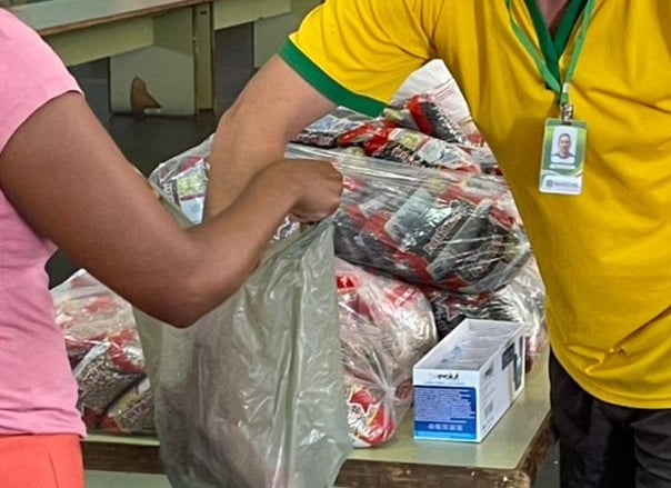 O kit é composto por um quilo de arroz, óleo vegetal, um quilo de carne, um litro de leite e um kit verde, composto por mandioca, polpa de fruta, hortaliça e fruta.