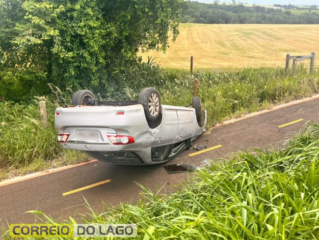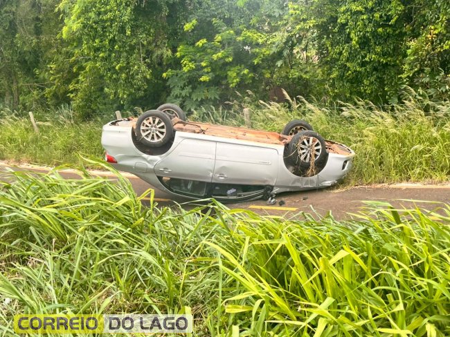 Veículo capota e para com as rodas para cima na PR-317 em Santa Helena