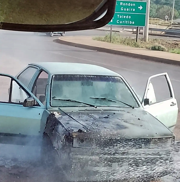 Na tarde de ontem, segunda-feira (30), um veículo, possivelmente um Gol, pegou fogo na entrada do município de Quatro Pontes, próximo ao portal que dá acesso à cidade para quem vem de Dois Irmãos – Toledo. As chamas iniciaram na parte frontal do carro, sugerindo que o incêndio teve origem no capô.