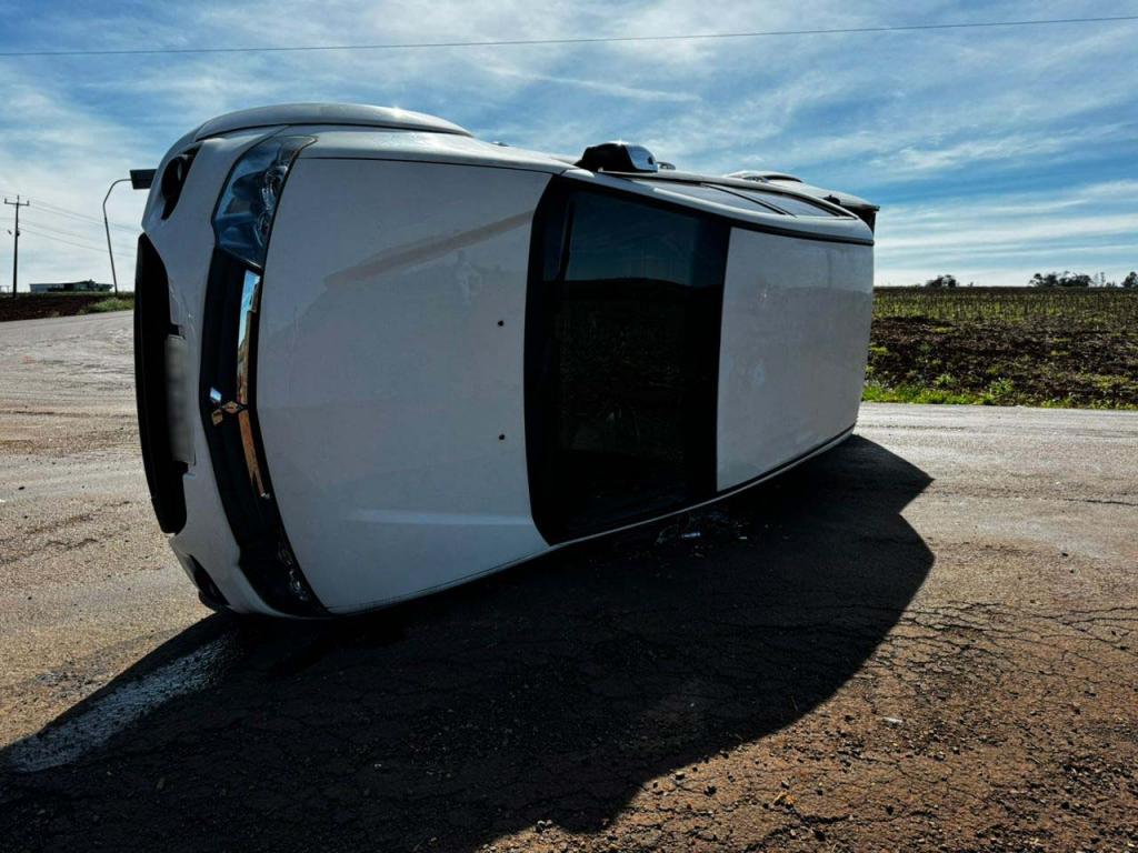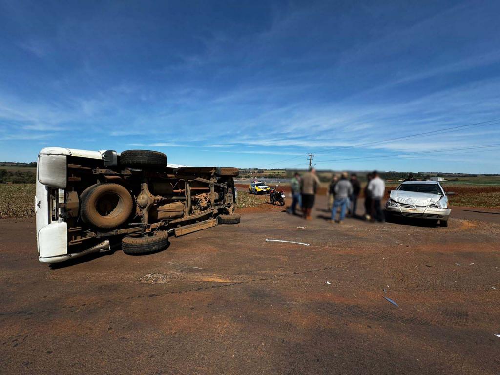 Um veículo Mitsubishi L200 Triton, placas de Santa Catarina, tombou após uma batida ocorrida na estrada municipal que liga Nova Santa Rosa ao distrito de Alto Santa Fé.