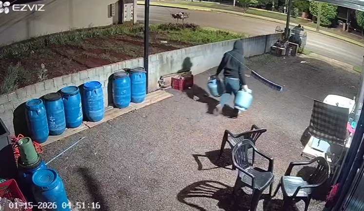 Um indivíduo furtou dois botijões de gás do pátio de um estabelecimento comercial em Marechal Cândido Rondon, na madrugada desta quinta-feira (15), por volta das 4h45, ao invadir o local, conforme mostram imagens de câmera de segurança, motivando o registro da ocorrência e a busca do suspeito pelas autoridades.
