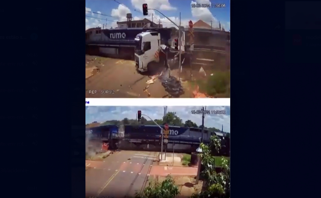 Imagens de câmera de segurança registraram o momento em que uma carreta avança o sinal vermelho, atravessa a linha férrea e bate em um trem, na manhã deste domingo (18), segundo o Corpo de Bombeiros.