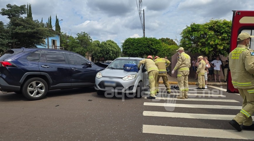 Colisão envolveu três veículos no cruzamento das ruas 12 de Outubro e Paraná; vítima sofreu ferimentos no rosto